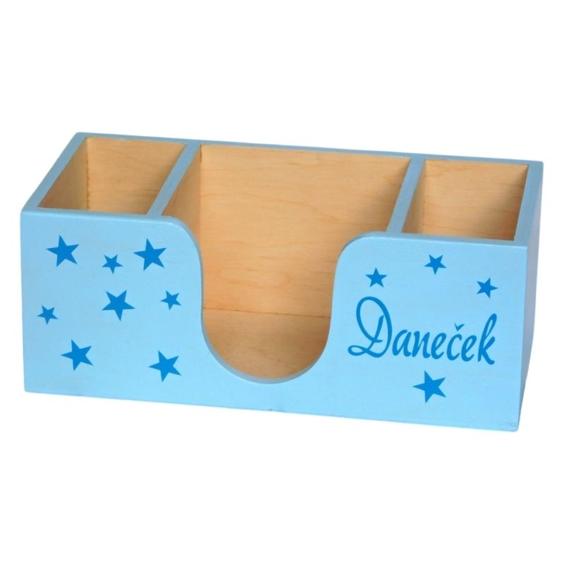 Stojánek je vyrobený ze dřeva a je zdobený jménem a hvězdičkami.