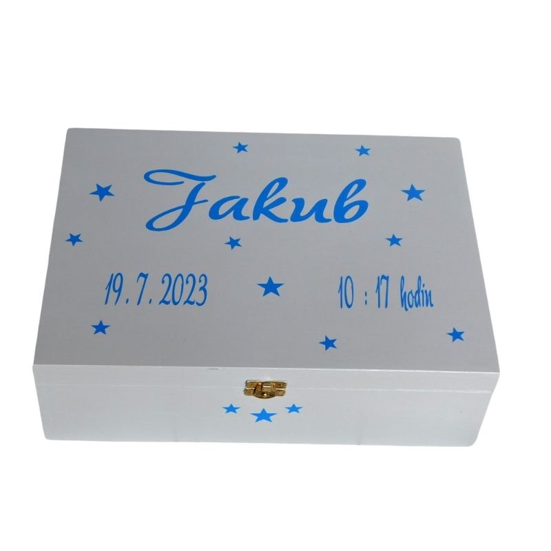 Krabičku zdobí jméno dítěte i s údaji, je proto krásným osobním dárkem. Je možné ji využít na fotky, na drobnosti, zoubky, vlásky, první botičky, oblíbená hračka nebo plínečka...zkráta na vše, na co si budete chtít uchovat vzpomínky. Krabička je uzaviratelná, mosazné kovové zapínání.