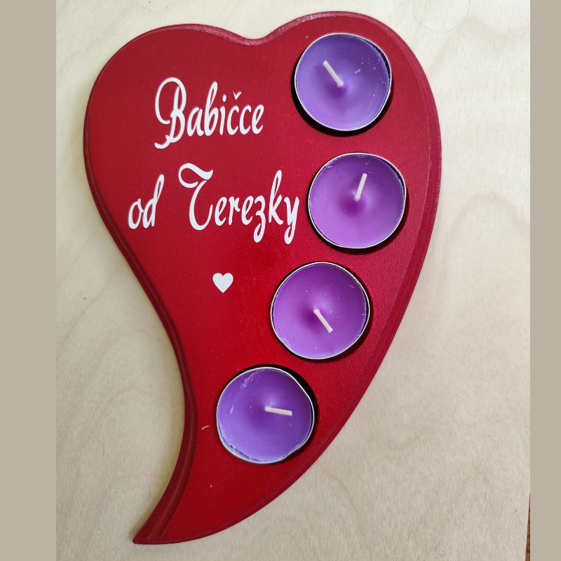 Hledáte osobní dárek pro babičku k narozeninám, svátku, Vánocům nebo jen tak pro radost? Svícen s osobním věnováním babičku jistě velmi potěší. Svícen je vyrobený z mdf dřevěné desky a má otvory na 4 čajové svíčky. Na srdíčku je nápis Babičce od a doplněný jménem na vaše přání.