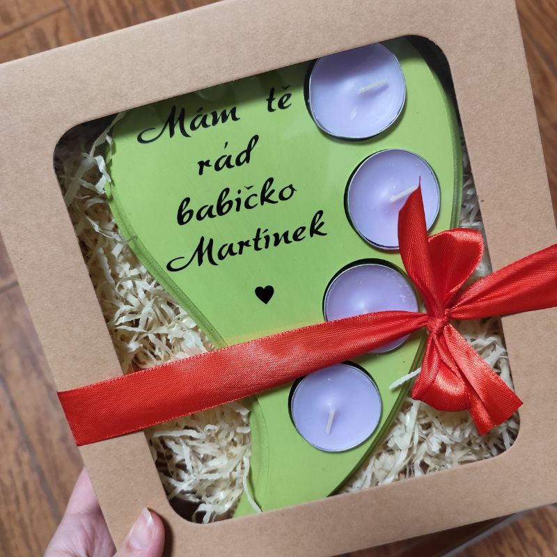 Hledáte osobní dárek pro babičku k narozeninám, svátku, Vánocům nebo jen tak pro radost? Svícen s osobním věnováním babičku jistě velmi potěší. Svícen je vyrobený z mdf dřevěné desky a má otvory na 4 čajové svíčky. Na srdíčku je nápis Mám tě rád/ráda babičko a doplněný jménem na vaše přání.